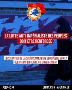 L’Action Communiste Européenne (ACE), dont notre Parti est le seul membre pour la France, a publié une déclaration intitulée « La lutte anti-impérialiste des peuples doit être renforcée ». Vous pouvez la retrouver en français ci-dessous et en anglais ici : https://www.eurcomact.org/m-article/Statement-of-the-European-Communist-Action-on-the-imperialist-war-in-the-Middle-East/